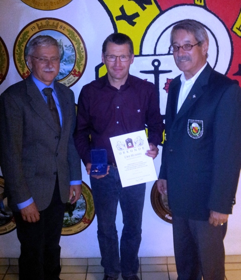 Anlässlich der Jahreshauptversammlung des Ortenauer Schützenkreises im Vereinsheim der KKSG Kork wurde Uwe Hummel (Mitte) vom Sportschützenverein Leutesheim e.V. das Ehrenkreuz in Silber des Deutschen Schützenbundes verliehen. Der Leutesheimer Vereinsvorsitzende wurde damit für seine besonderen und langjährigen Verdienste um die Deutsche Schützensache ausgezeichnet. Die Ehrung wurde vom Kreisoberschützenmeister Klaus Stoffel (rechts) und Landesschatzmeister Karl-Heinz Teuscher (links) vorgenommen.