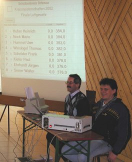 | Uwe Hummel (Mitte) bewies während diesen 10 Schuß die besseren Nerven und schoß nach souveräner Manier konstante 10er. Mit dem besten Finalergebnis verbesserte er sich von dem dritten auf den ersten Platz und verteidigte damit seinen Meistertitel. Er erzielte insgesamt 482,8 Ringe und verwies den amtierenden Landesmeister Mario Nock (482,6) auf den zweiten Platz. Heinrich Huber aus Durbach (479,9), der das beste Vorkampfergebnis erzielte, musste sich mit Bronze begnügen. Die weiteren Final-Platzierungen: Thomas Weislogel, Leutesheim (478,5); Frank Schröder, Leutesheim (476,2); Paul Kiefer, Durbach (472,9); Jürgen Ehrhardt, Bodersweier (472,6) und Walter Serrer, Durbach (472,3). | ![]() |